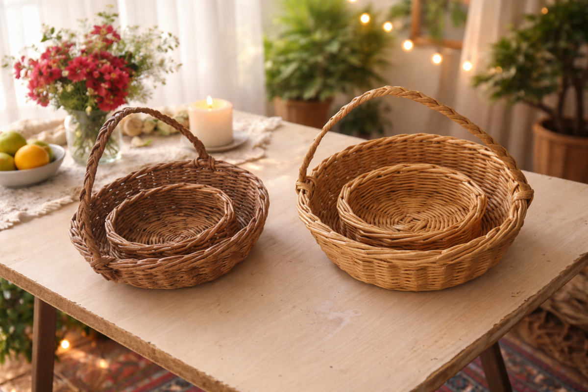 İki bölmeli, masanıza bohem şıklığı katacak, uzun ömürlü bambu sunum tabağı. Sepet