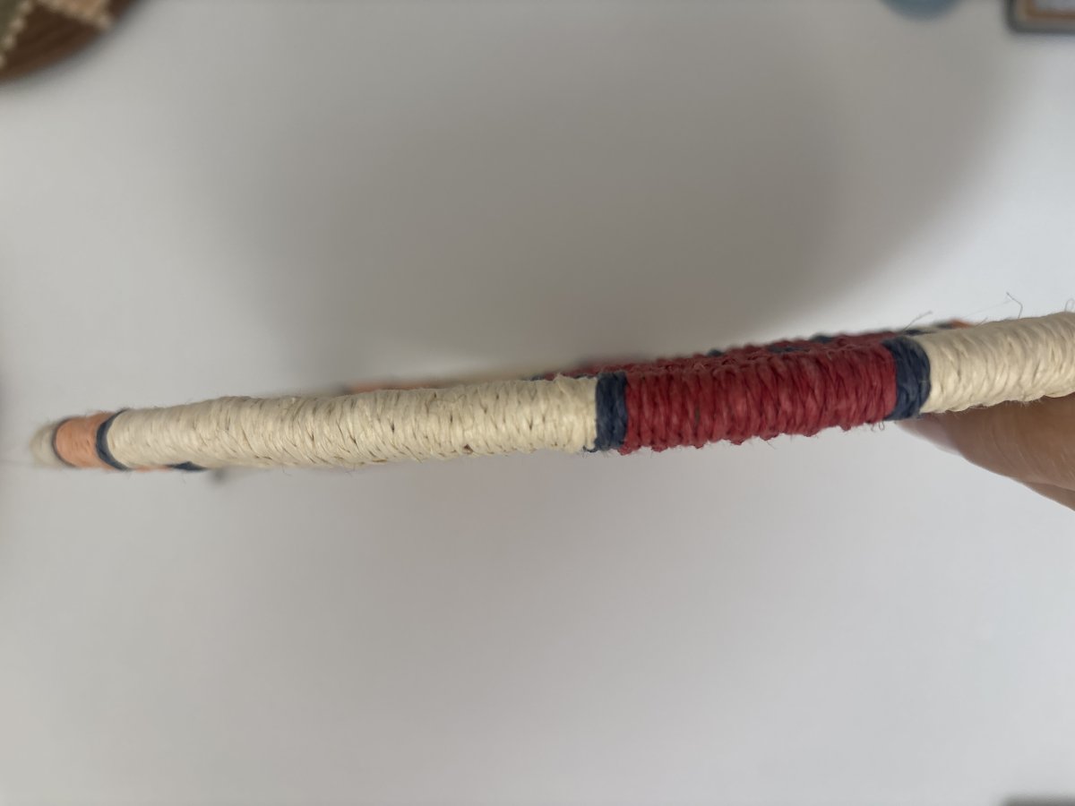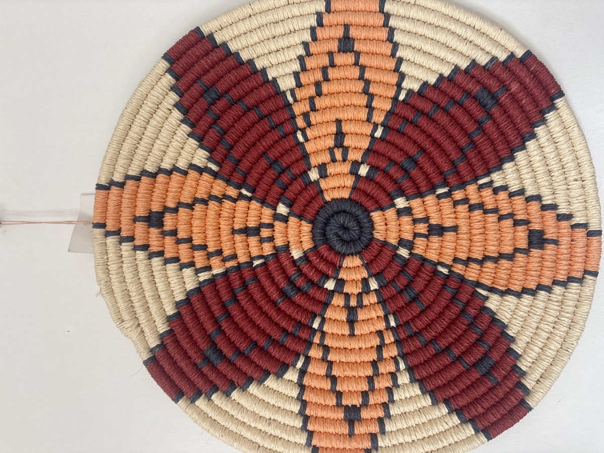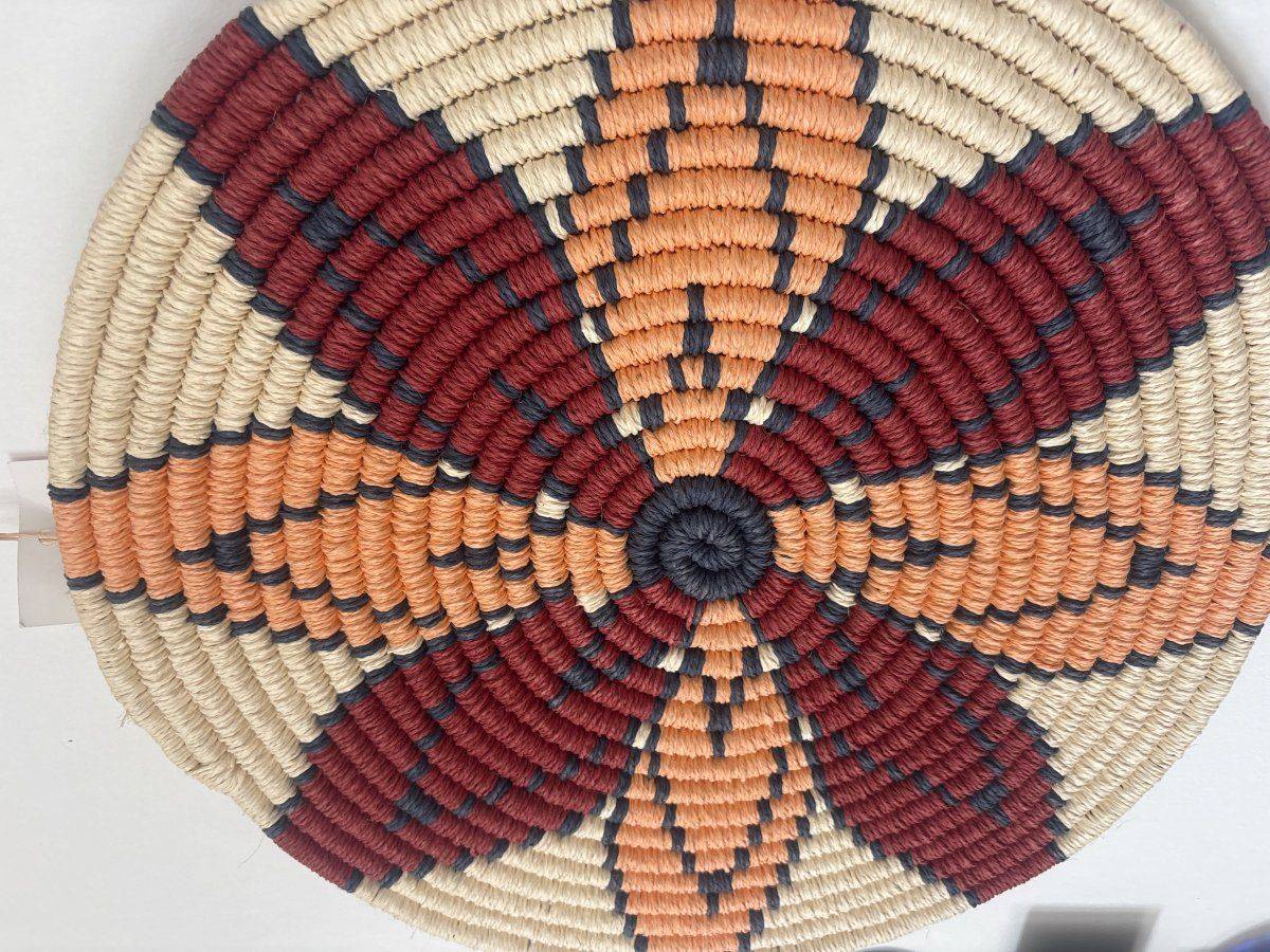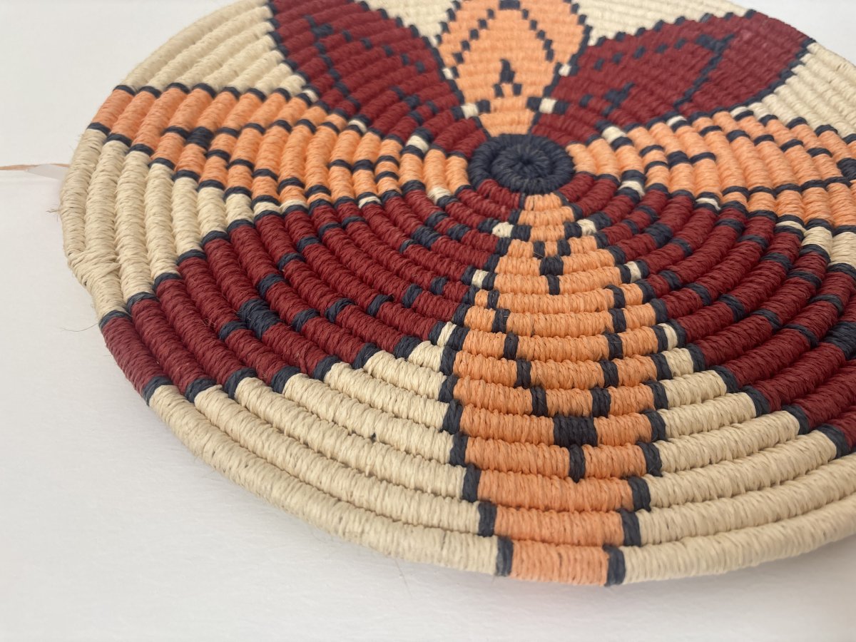 Tamamen kâğıt ip kullanılarak özenle örülen bu duvar dekoru, el emeğinin zarafetini modern tasarım anlayışıyla buluşturuyor. Dairesel formu ve simetrik desenleriyle dikkat çeken ürün, turuncu, bordo ve doğal tonların uyumuyla bulunduğu ortama canlılık ve karakter katıyor.